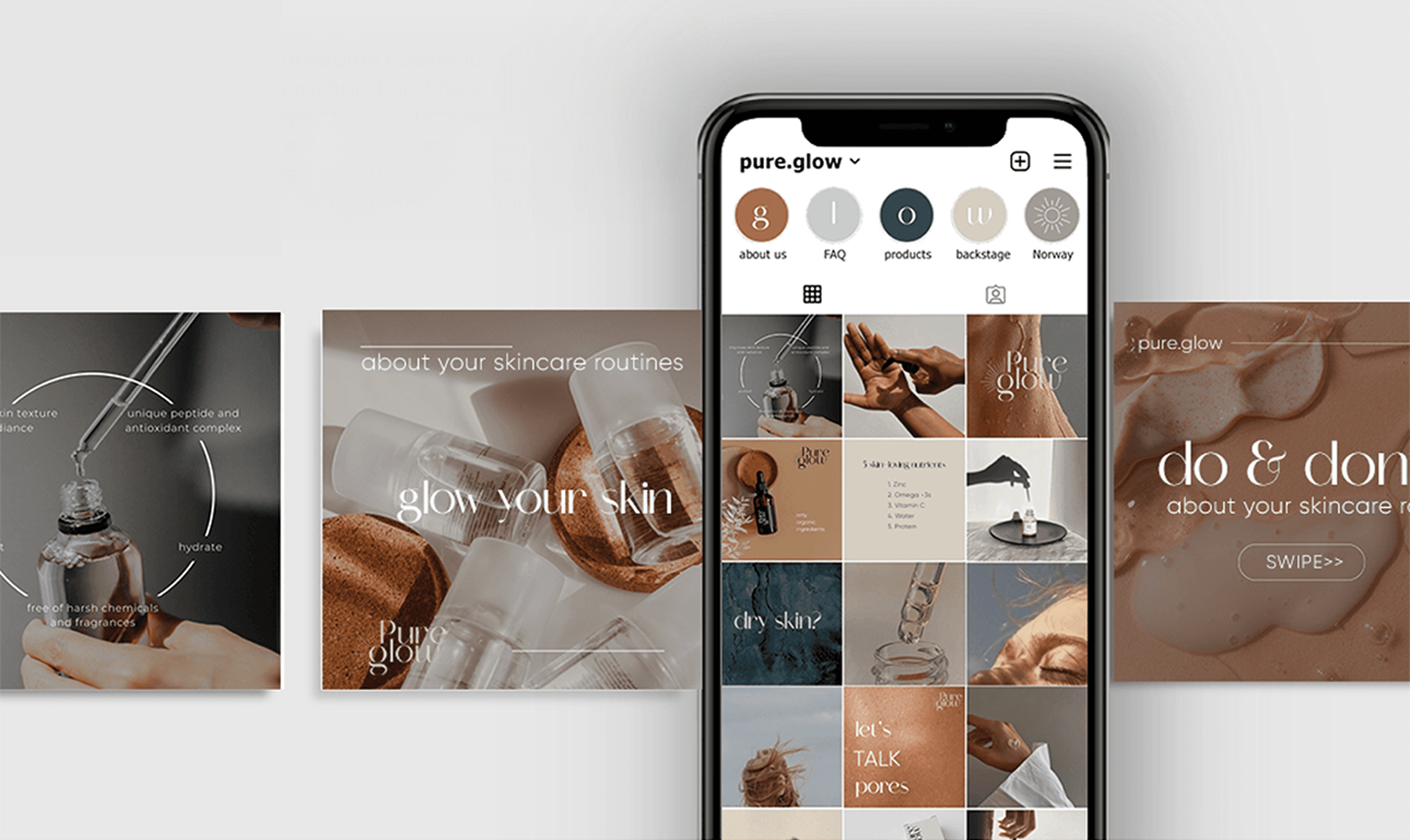 Dla Pure Glow, norweskiej marki kosmetycznej oferującej naturalne, wegańskie produkty do pielęgnacji dłoni i twarzy, zaprojektowałam spójną identyfikację wizualną, która odzwierciedla fundamentalne wartości marki: czystość, delikatność i troskę o skórę. Projekt obejmował opracowanie kluczowych elementów wizualnych, takich jak logo, paleta kolorów i typografia, a także spójnych estetycznie layoutów na potrzeby mediów społecznościowych. Język wizualny został dostosowany tak, aby podkreślić minimalistyczną i inspirowaną naturą filozofię marki, tworząc spokojną i godną zaufania obecność w kanałach cyfrowych. W ramach procesu tworzenia treści wykorzystałam również narzędzia sztucznej inteligencji do generowania angażujących i spójnych z marką materiałów wizualnych oraz komunikatów, co zwiększyło zarówno efektywność, jak i kreatywność.